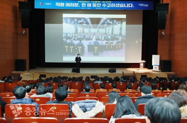 특히 맹정호 서산시장이 열린 특강을 통해 문재인 대통령의 서산해미읍성 방문과 자원회수시설 공론화 과정, 터미널 이전 토론회, 인사이동 등에 대한 비하인드 스토리로 올 한해 열심히 달려온 직원들에게 칭찬 및 격려 메시지를 전달하고 더 나은 내년을 위해 전 직원이 결의를 다지는 특별한 시간도 가졌다.