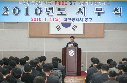 "현재에 만족하지 않고 변화 속에서 발전하는 명품 동구 만들 것" 대전 동구(구청장 이장우)가 4일 오전 구청 대회의실에서 이장우 구청장 및 간부 공무원 등 200여명이 참석한 가운데 2010년 시무식을 개최했다.