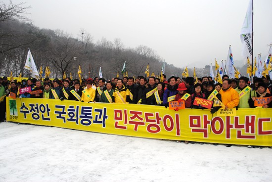 민주당 정세균 대표는 10일 오전 동학사에서 "국가 균형 발전의 핵심사업인 행정중심 복합도시 원안 사수라고 하는 우리당의 중요한 목표를 이것은 절대 수용할 수 없고 국민과 함께 국가균형발전의 핵심사업인 행복도시 원안추진을 다시 한번 결의 하자"고 주문했다.