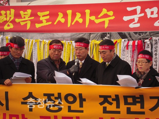 이어 박수현 민주당 충남도당 행복도시 무산음모저지 특별위원장은 “수정안 전면거부, 공주연기주민 총파업투쟁”, “수정안 전면거부 원안사수, 세종시 예정지 주민 80%이상 서명운동을 통한 여론결집”, “이완구 전)충남도지사를 포함한 충청지역 한나라당 소속 단체장, 광역의원, 기초의원 전원 탈당 요구”, “충청권 지역별 규탄집회 개최”, “충청권연대회의 투쟁위원회 체제 전면 전환” 등 다섯 가지의 투쟁방안을 제안했다.
