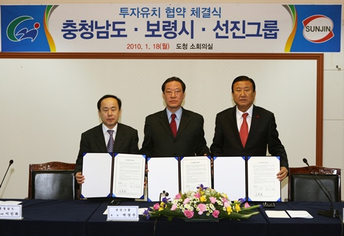 충남도는 18일 도청 소회의실에서 이인화 충남도 도지사 권한대행, 신준희 보령시장, 박성수 선진그룹 회장이 참석한 가운데 보령시 남부산업단지 84만2천㎡에 2013년까지 4,110억원을 투입, 중장비 공장 건설 투자협약을 체결했다고 밝혔다.