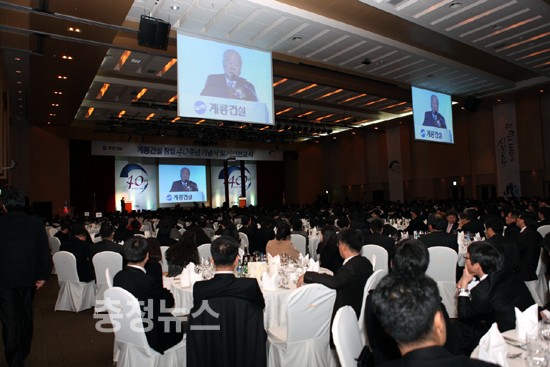 계룡건설은 22일 오전 대전컨벤션센터에서 이인구 명예회장과 이시구 회장, 한승구 사장 및 각 계열사 사장단, 임직원, 협력업체 관계자 등 3000여명이 참석한 가운데 창립 40주년 기념식을 갖고 ‘비전 2020’을 제시했다