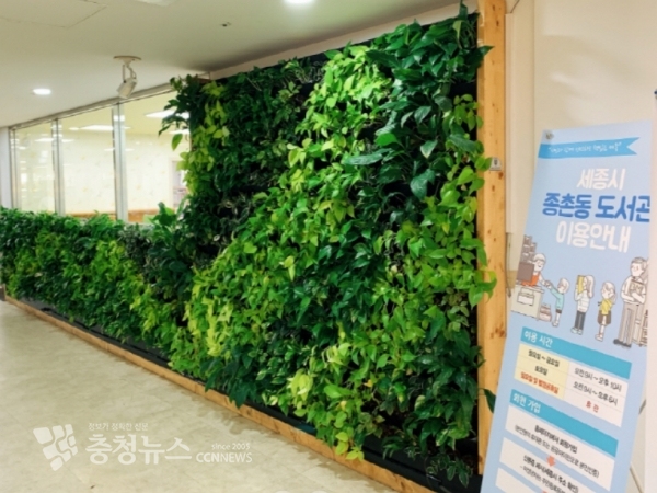 세종특별자치시 종촌동(동장 박미애)이 지난해 복합커뮤니티센터 로비와 도서관 입구 등에 조성한 수직정원을 새롭게 단장해 주민들에게 개방했다.