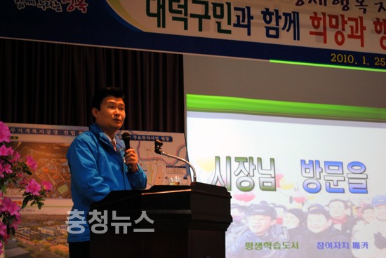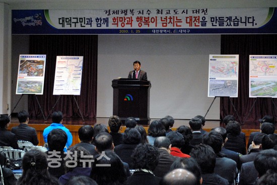 박성효 대전시장은 25일 정용기 구청장, 최충규 구의회 의장을 비롯한 주민 250여명이 참석한 가운데 열린 2010년도 대덕구 연두방문에서 올해 대덕구 지역 투자계획과 함께 주민들의 건의를 듣고 해결방안을 제시했다.