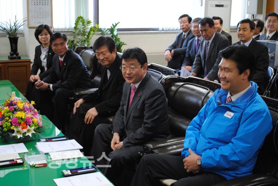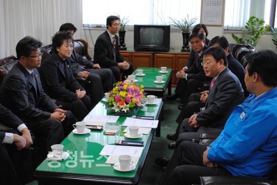 ▲ 정용기 대덕구청장 박성효 시장 연두방문을 환영하고 있다