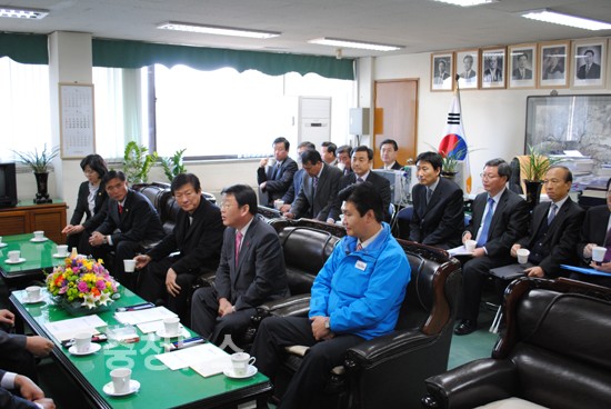 ▲ 박성효 시장 대덕구의회 방문 최충규 의장과 구의원들이 환담하고 있다.