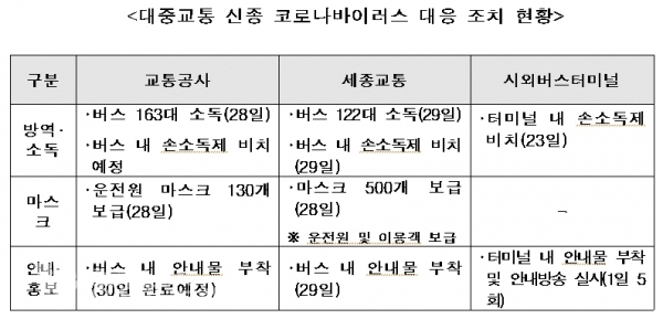 아울러  운수업체 운전원은 마스크를 착용토록 하고, 차랑 안에 손소독제 비치키로 했다. 타 지자체 관할, 세종시 관내 운행 버스도 소독을 실시하고 마스크를 착용하도록 협조 요청 했다.