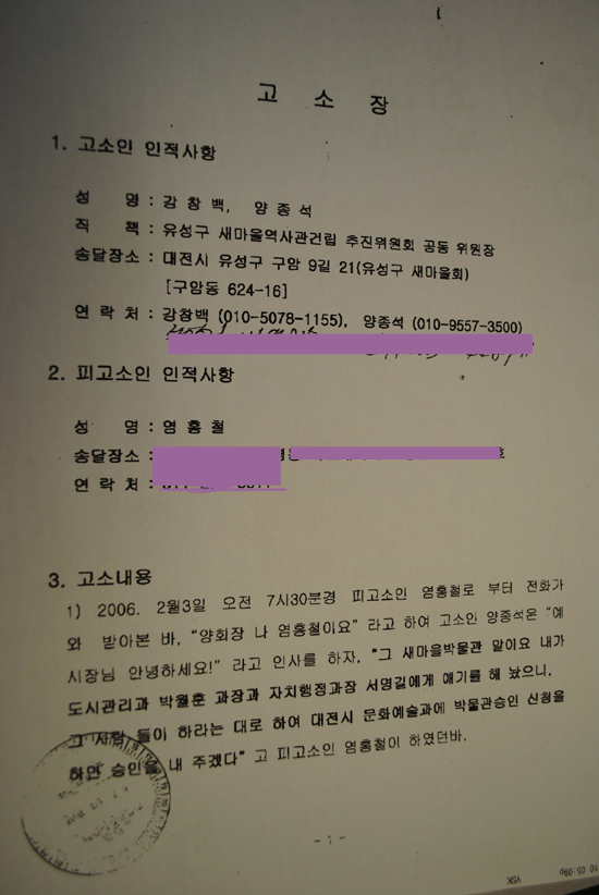 유성구 새마을 역사관 건립추진위원회 (공동위원장 강창백, 양종석)는 지난 1월 25일 오후 2시30분경 지난 2006년 염 前 시장이 재임시절 당시 새마을박물관 인허가 과정에서 잘못된 행정으로 피해를 보았다"며 대전지검에 고발장을 제출해 논란이 될 전망이다.