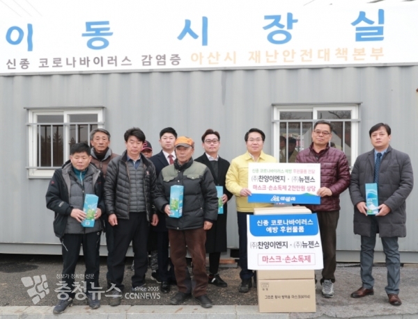 아산시 소재 중소기업인 ㈜찬양ENG(대표 박경모)와 ㈜뉴젠스(대표 이승완)는 2월 3일 초사동 현장이동 시장실과 재난안전대책본부에서 신종코로나 바이러스 예방물품인 마스크와 손소독제 약2000만원 상당을 전달했다.