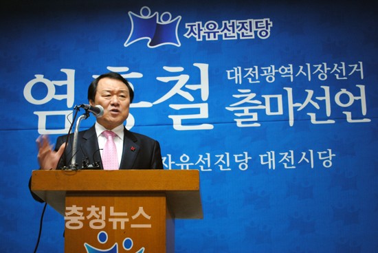 염홍철 前시장은 1일 오후 선진당 대전시당사에서 6,2 지방선거 대전광역시장 선거에 출마를 선언하고 “한국의 신중심도시 대전건설을 위하여” 출마한다고 밝혔다.