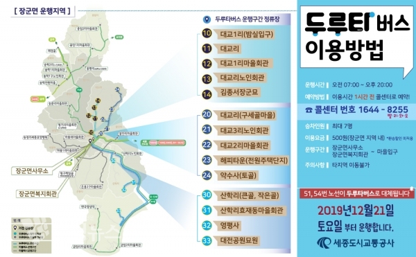수요응답형(DRT) ‘두루타’ 버스는 장군면사무소와 장군면 복지회관을 출발하며, 첫 번째로 대교1리 마을회관과 노인회관을 거쳐 김종서장군묘까지, 두 번째로 대교2리 마을회관과 해피타운을 거쳐 약수사(독골)까지,