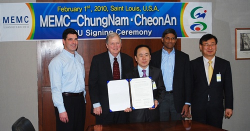 도에 따르면 지난 1일 미국을 방문 중인 이인화 충남지사 권한대행과 박한규 천안시 부시장이 미주리주 세인트루이스에 있는 MEMC 본사 회의실에서 세이커 사다시밤 대표와 투자 양해각서를 체결했다.