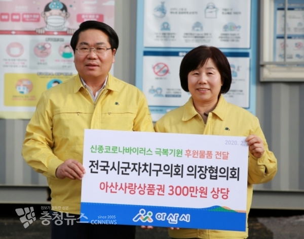전국의장협의회에서 기탁한 성금은 강필구 회장을 대신하여 김진호 충남의장협의회장이 아산시 재난안전대책본부를 방문해 김영애 아산시의회 의장에게 전달하였다.