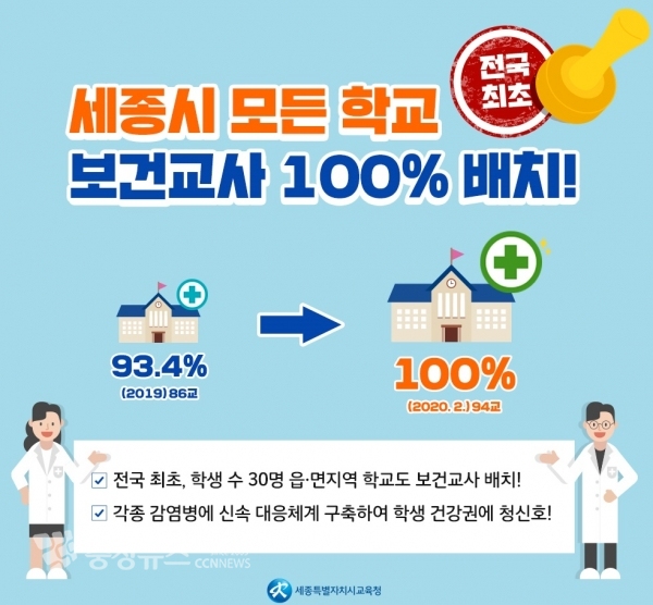 그동안 세종시는 총 92개 초·중·고등학교중 86개교(93.4%)에 보건교사를 배치했고 소규모학교인 5개교는 인근 학교 보건교사가 주 2회 순회근무를 해왔다.
