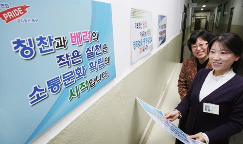 구는 이를 위해 각 부서별로 칭찬과 배려 포스터를 제작, 출입문에 부착하는 등 직원들의 지속적인 관심을 유도하고 있다.