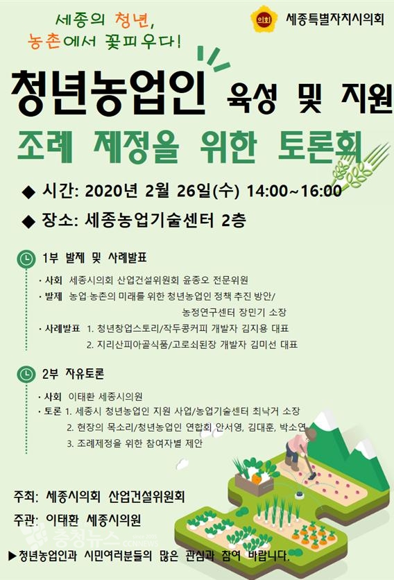 토론에선 세종시 청년 농업인 육성과 지원 방향에 대한 문제점과 개선점, 조례에 반영돼야 할 현실적인 정책 제안 등이 다뤄질 예정이다.