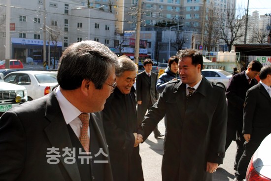 ▲ 이재오 위원장이 오찬장인 중구 문화동 신촌 설렁탕 집에 도착해 본지 기자와 만나 인사를 나누고 있다