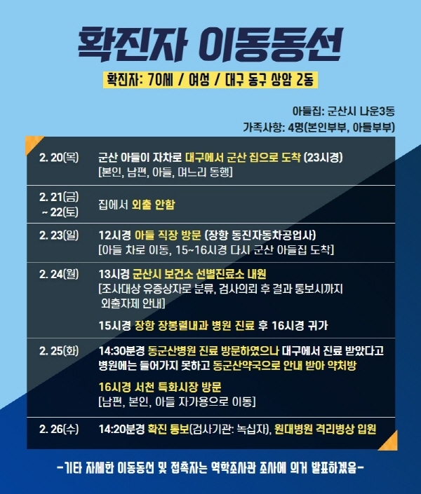 26일 코로나19 확진판정을 받은 A씨(70)는 대구에 거주하다가 지난 20일 군산에 사는 아들 집으로 왔다가 23일부터 기침 등의 증상을 보이자 선별진료소를 찾았다고 한다.
