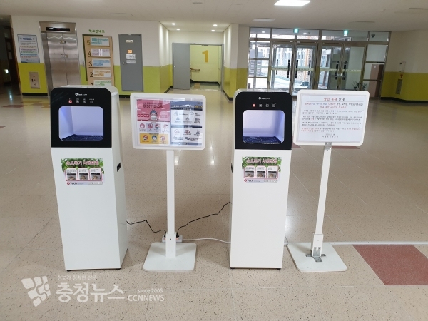 세종시 학교에 완비된 각종 방역물품과 자동 손소독제