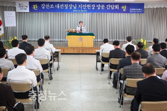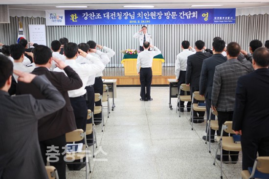 강찬조 대전지방경찰청장은 24일 오전 10시 대전동부경찰서를 초도 방문해 2010년도 중점 추진업무를 보고 받고 직원들을 격려 했다 ▲ 강찬조 대전경찰청장, 대전동부경찰서 초도 방문 이날 강청장은 시민들이 평온하고 안정된 삶을 영위할 수 있도록 치안상태를 유지하고 있는데 대해 노고를 치하하고 법과 원칙이 존중되는 사회안전 확보와 각종 범죄예방 활동 철저 등 지역 치안질서 유지에 최선을 다해 줄 것을 당부했다 ▲ 강찬조 대전경찰청장, 대전동부경찰서 초도 방문 또한, 이날 강청장은 동부경찰서 통합유치장을 방문하여 유치인들의 애로 및 불편함을 청취하였다. 저작권자 © 충청뉴스 무단전재 및 재배포 금지 김거수 기자 다른기사 보기 기사가 마음에 드셨나요? 충청뉴스 좋은 기사 후원하기 1,000원 3,000원 5,000원 10,000원 30,000원 50,000원 직접입력 비회원 약관동의하기 ※ 소중한 후원금은 더 좋은 기사를 만드는데 쓰겠습니다.