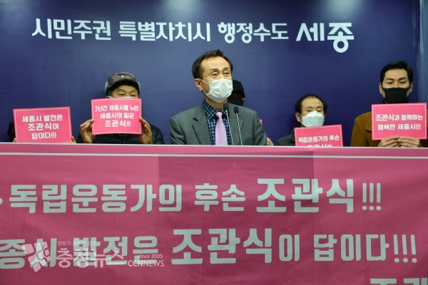 조관식을 국회의원으로 만드는 모임 대표 허만성 외 회원일동은 5일 시청 브리핑룸에서 기자회견을 갖고 세종시에 전략공천을 반대하고 나섰다.
