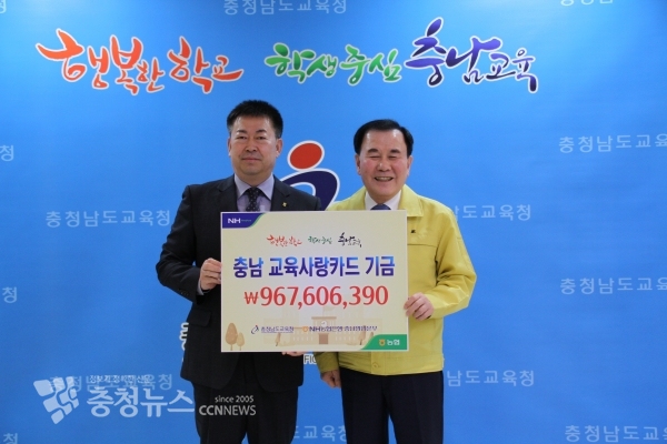 충청남도교육청(교육감 김지철)은 12일 농협은행 충남본부로부터 지난해 충남교육사랑카드 사용으로 조성된 기금 9억 6760만 원을 전달받아 전액 학생 복지사업에 사용하겠다고 밝혔다.