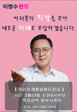 미래통합당 이명수 아산갑 국회의원 예비후보가 법정선거비용모금을 위한 아산미래희망펀드를 출시한다.