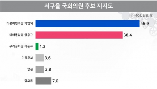 대전인터넷신문기자협회(충청뉴스, 디트뉴스, 굿모닝충청, 대전뉴스)와 금강일보가 여론조사 전문기관인 리얼미터에 의뢰한 여론조사 결과에 따르면, 서구을 유권자의 45.9%는 민주당 박 후보를, 38.4%는 통합당 양 후보를 각각 지지하는 것으로 나타났다.