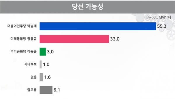 실제 ‘누가 당선될 가능성이 높다고 생각하느냐’는 질문에 대해서는 ‘박범계 후보가 이길 것’ (55.3%)이라고 예측하는 응답자가 양홍규 후보(33.0%)에 비해 무려 22.3%p 많았다.