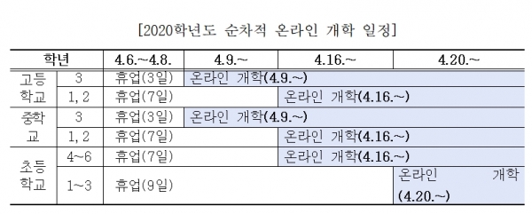 고3, 중3은 4월 9일부터 온라인 개학을 시작하고, 4월 16일에는 고등학교 1~2학년과 중학교 1~2학년 및 초등학교 4~6학년이, 4월 20일에는 초등학교 1~3학년이 온라인 개학을 한다. 학년별로 개학 후 2일은 원격수업 적응기간으로 운영하여 수업 콘텐츠와 플랫폼 활용법을 체험하는 등 본격적인 원격수업에 대비한다. 3월 23일부터 온라인 개학 이전까지의 휴업일에 대해서는 수업일수와 수업시수의 감축을 허용하기로 하였다.