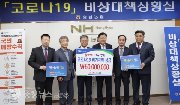 농협중앙회 충남지역본부(본부장 길정섭)는 2일 농협충남본부 경영전략실에서 코로나19에 맞서 확산방지와 종식을 위해 애쓰는 대구⦁경북지역의 농업인과 의료사각지대에 놓인 취약계층을 돕기 위한 성금 6천만원을 전달했다.