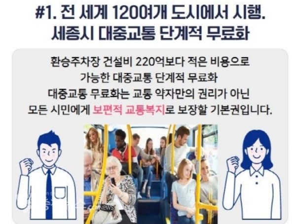대중교통 무료화에 따른 재원 마련은 세종교통공사에 복합환승센터를 운영하게 하여 재정자립을 지원하고 광고수익을 올리도록 버스 후면광고 허용 법률 지원도 검토하겠다는 것이다.