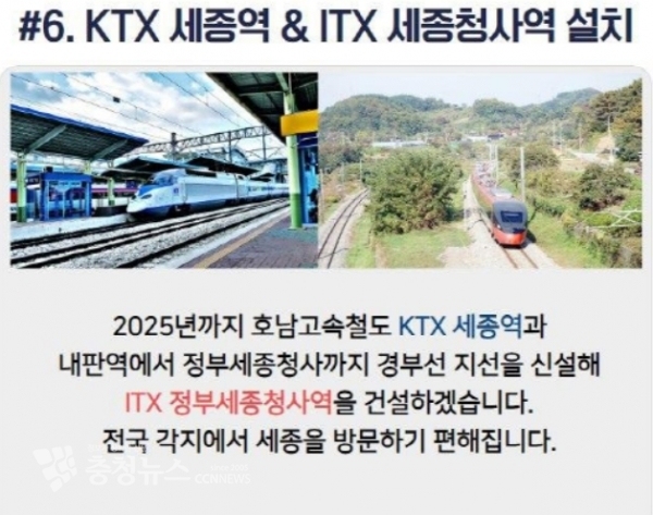 이와 동시에 천안-세종-대전 도심을 연결하는 광역버스를 도입해 충청권을 더 쉽게 오갈 수 있도록 하고 KTX 세종역을 다시 추진함과 동시에 내판역에서 정부세종청사까지 경부선 지선을 신설 ITX 정부세종청사역을 건설해 행정수도뿐 만 아니라 대중교통중심도시로 자리매김하는 비전도 제시했다.
