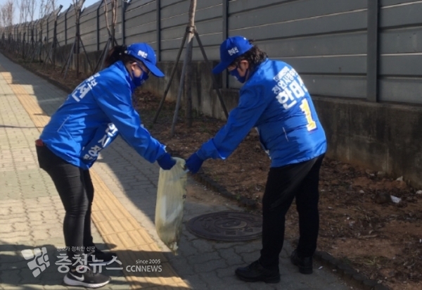 한태선 캠프 선거유세원은 공식선거운동이 시작된 지난 2일부터 두 명이 한 조가 되어 천안천과 원성천, 쌍용공원, 불당동 상업지구 등 시민들이 주로 찾는 공원과 도심지역의 쓰레기를 줍는 환경정화활동을 펼치고 있다.