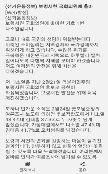 김태흠 후보측 관계자는 “나소열 후보가 지난 2월 26일 전화 문자메시지를 통해 다수의 지역구민에게 여론조사 결과 본인이 오차범위를 넘기며 앞섰다는 내용의 허위사실을 공표했다”고 밝혔다.