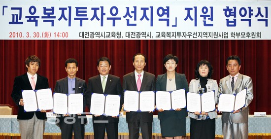 대전시교육청(교육감 김신호)이 2005년부터 교육․문화 여건이 열악한 저소득층 밀집지역 취약계층학생의 다차원적 수준 제고하기 위해 추진하고 있는 「교육복지투자우선지역」지원사업이 금년 부터는 대전시의 사업비 지원 받을 전망이며, 지원 협약식이 30일 오후 대전시교육청 1층 대강당에서 실시되었다.