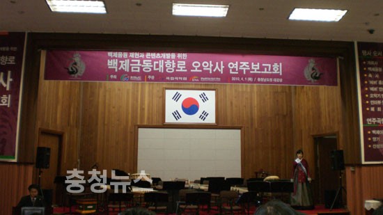 이날 연주는 국립국악원에서 제작한 오악기(완함, 종적, 배소, 거문고, 북)를 포함한 국악 오케스트라가 2010세계대백제전 개․폐막식 공연에 연주될 백제 창작곡 9곡 중 ‘산성의 아침’, ‘백제아리랑’, ‘영기’ 등 3곡을 선보였다.