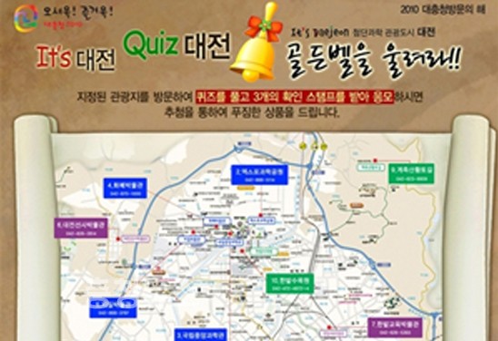 그동안 온․오프라인을 통해 전국으로 홍보된 대전관광지도에는 방문하여 퀴즈를 풀어야 할 대상지와 관광설명이 적혀 있으며, 출제된 해당 관광지의 퀴즈를 풀고 정답을 적어야 하는데 3개소 이상의 관광지를 방문, 정답을 적은 지도에 소인을 받고 현장에 비치된 응모함에 넣게 된다.
