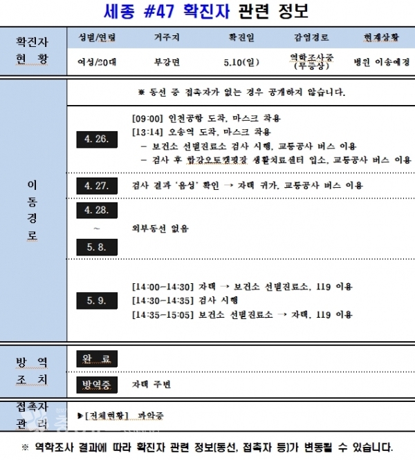 세종시 코로나19 확진자가 43일 만에 10일 1명이 추가로 발생했다. #47번째 확진자는 부강면에 거주하는 20대 여성이다.