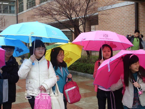 지난 2일 오후 갑자기 내린 비에도 교실의 사물함과 우산보관함에 있는 우산을 펼쳐들고 즐겁게 하교하는 학생들의 얼굴은 웃음이 가득하기만 하고 사용한 우산은 다음날 잘 말려서 다시 학교로 가져와 보관해두었다가 다음에 사용한다.