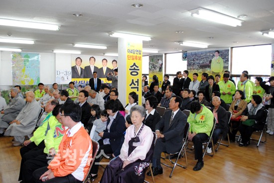 송 후보는 (사)대한불교 청년회 정웅정 중앙회장, 전국 대한불교 중앙신도회 이상근사무총장, 광제사 주지 경원스님 및 불교계 스님들과 지인들을 모시고 개소식을 가졌다.