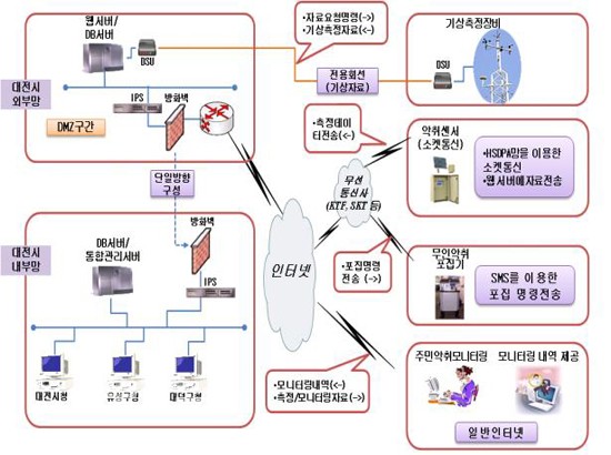 동 시스템은 ▲풍향·기압·온도 등 기상을 측정하는 기상탑 ▲암모니아·황화수소 등 복합악취를 측정하는 악취센서 ▲원격 무인악취포집기 ▲주민모니터요원의 후각에 의한 냄새의 종류와 강도를 모니터할 수 있는 모니터링시스템 ▲악취발생지역을 색출할 수 있는 지리정보시스템(GIS) 등으로 구성되어 있다.