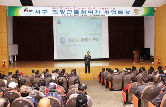 대전시 서구(구청장 가기산)는 직업훈련기회 제공으로 희망근로참여자의 취업을 돕기 위해 27일 구청 대강당에서 취업특강을 열었다.