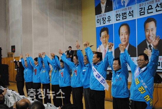 동구는 좀 더 변해야 한다 대전의 중심이 되어야 한다 선거에 출마하는 10명의 후보들의 당선을위해 목숨을 바치겠다면서 오는 6,2지방선거는 대전 충남에서 지역정당인 선진당을 심판하는 날이라고 선언했다.