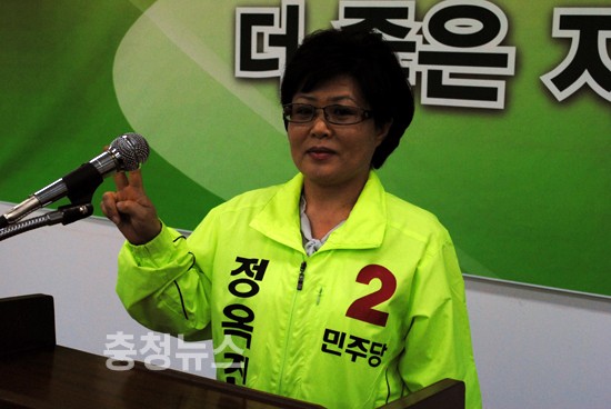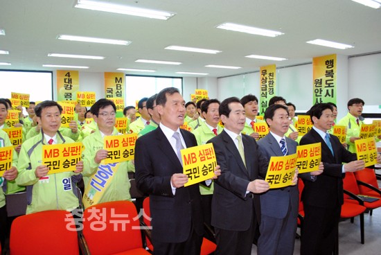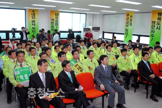 정 대표는 이날 행사에도 공천자들과 함께 세종시 사수라는 스티커를 들며 의지를 불태웠다.
