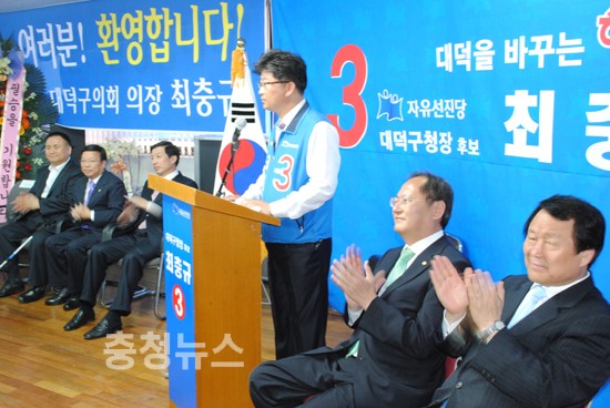 자유선진당 최충규 대적구청장 후보는 8일 오후 오정동 64-15 중앙스포츠 2층 에 선거사무소 개소식 행사를 가졌다.