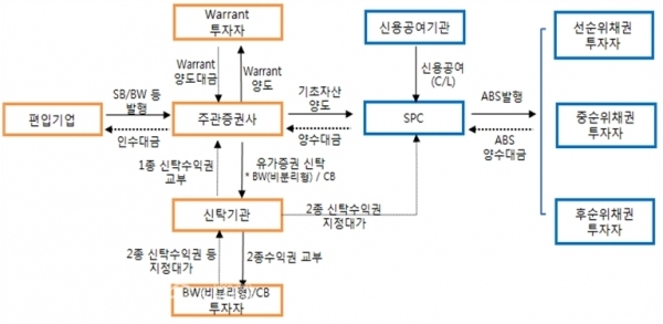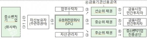 ① 중소벤처기업이 발행한 회사채를 주관증권사가 인수, ② 주관증권사는 동 자산을 집합(Pooling)하여 SPC에 양도, ③ SPC는 동 자산을 담보로 자산유동화증권(선․중․후순위채권) 발행,④ 선순위채권, 우량 금융기관에서 신용보강, ⑤ 자산유동화증권 중 선․중순위채권은 시장매각하여 자금조달, ⑥ 중진공(정부재정)은 후순위채권 인수, ⑦ 선․중․후순위채권 매각자금으로 자금지원