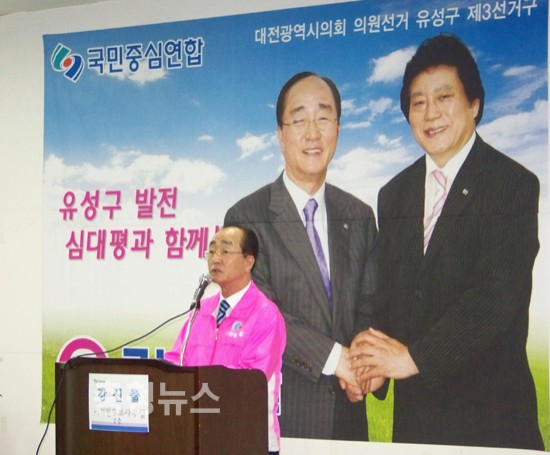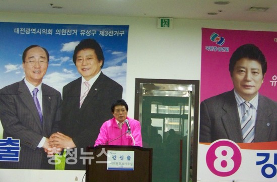 유성구 전민동 엑스포코아 상가 5층에 마련된 선거사무소에 참석한 국민중심연합 심대평 대표는 ‘오랫동안 지역경제 발전의 기수’이며, 또한 강하고 신나게 출발하는 기호8번 강신출 후보를 ‘믿음과 신뢰’가 있기에 이 자리에 서있게 하였으니 이번에는 ‘꼭 지역의 일꾼으로 선택해 달라’고 했다.