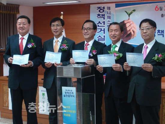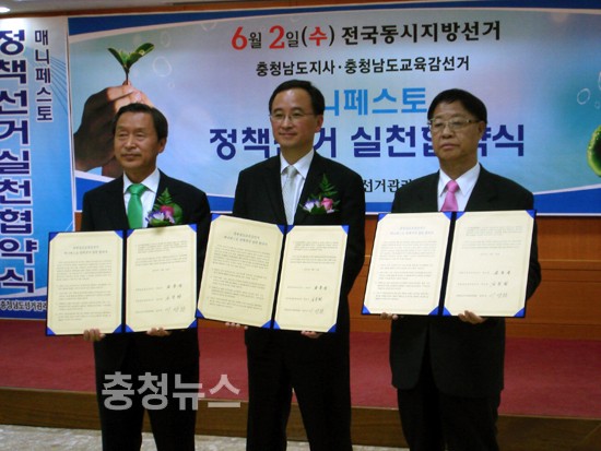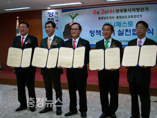 충남도지사 후보와 충남교육감 후보들이 참석한 가운데 18일 오후 충남선거관리위원회에서 매니페스토 정책선거 실천협약식을 가졌다.