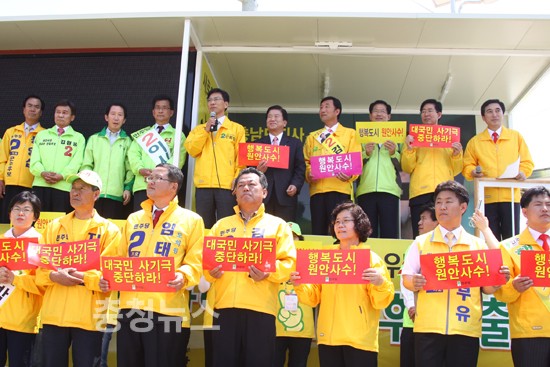 이자리에서는 김원웅, 이시종 등의 광역단체장 후보들이 결의문을 함께 낭독하며 지방선거 승리와 세종시 사수, 이명박 정권 심판의 의지를 다졌는데 김원웅 대전시장 후보는 국토균형발전의 철학을 제시한 정당이 민주당이라며 이번에 민주당원이 당선되면 세종시 수정안도 끝장날 것이라며 기세를 올렸다.